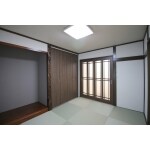 重厚感のある大黒柱、大きめの床の間という完全な和スタイルのなかに、デザイン性の高い引き戸、琉球畳を組み合わせることで、落ち着きのあるモダンテイストな和室に仕上げました。