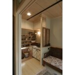 旧来のミニキッチンを利用して壁紙でよみがえらせた扉です。水屋では、窓が取れない正面部分に明り取りを模したビルトイン照明を内蔵しております。風炉と裾の和紙貼にて、茶室として仕上げました。