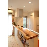 大きく間取り変更して、キッチンとリビングに対して対面式に据え、会話の弾むつつ、奥の祖母様のことも気にかけれる様に提案。 キッチンの横の勝手口は一直線に洗面スペースに繋がることで、家事動線は以前に比べ物にならないほど楽になりました。