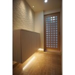 玄関と収納のスペースを広く取るため、一部の壁と棚を取り除き、統一したデザインの扉やエコカラットを施す間取り変更をご提案致しました。