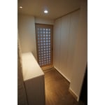 玄関を入って右側にキッチンへと続くL字型収納(写真・左側)がありました。扉はなく、ロールカーテンで目隠しをされていました。