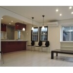 キッチンもLDK空間の一部としてインテリアになるようなご提案をしました。品のある鮮やかな赤い色が際立っています。2ヶ所の窓枠を黒系の色で塗装したので、ダイニングの照明器具は、同系色のチェーンや飾りの付いたペンダントタイプを3つ並べました。窓の間にあった下り壁は、下側をアーチ形状にして柔らかいイメージになるようにしました。