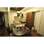 隠したい部分は、奥に配置して、半対面キッチンにしました。 食器棚の横に、冷蔵庫、その横には食品庫を設置いたしました。 オシャレで、機能的で、収納量豊富なキッチンです。