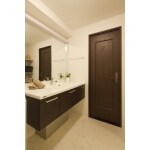ホテルのバスルームをイメージした洗面スペースには、床まわりの空間をすっきりと見せる、宙に浮いたようなフロートタイプ風の洗面台を採用しました。横長の大きな鏡が空間に広がりを持たせ、ホテルのような高級感と、非日常的な空間を演出しています。日々の身支度が至福の時間になる。そんな洗面空間になりました。