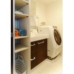 洗面室は限られたスペースの中で、収納スペースと洗面台・洗濯機置き場を設置する必要がありました。 洗面台はコンパクトですが、最新設備で洗面ボウルは広々と使いやすい商品をお選びいただきました。
