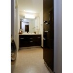 洗面室は洗面台や収納スペースを落ち着いた色合いでご提案させていただき、シックで落ち着いた空間に仕上げることが出来ました。