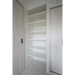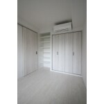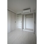 マンションの造りとして個室にはエアコンを設置出来ませんでしたが、隠ぺい配管にすることで設置を可能にしました。収納は折れ戸の収納とオープンの収納に分け、可動棚を取付けました。棚柱は金属色ではなくホワイトにすることで壁紙と統一感を出しています。
