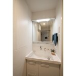 洗面化粧台はリクシルのピアラを採用しました。壁面にはJスクープ手掛けですっきりとした扉の吊戸棚を埋め込み、タオルを収納できるようにしています。