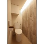 トイレはもともと洗面化粧室からアクセスする造りになっていましたが、利用しづらかったため、廊下からアクセスできるようにレイアウト致しました。大きな梁の下になってしまいましたが、幕板を造作し、上部に間接照明を取り付けることで、雰囲気のあるトイレ空間を実現しました。