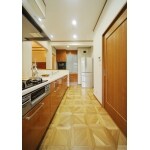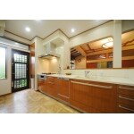 キッチンを北側から南側に移動することで、家事動線の改善を実現しました。構造上、外せない柱に沿って対面キッチンを配置し、パントリーを設けて収納スペースも充実させました。空いたスペースを活用し、ダストボックスを置ける収納を造作し、ダイニング側にも収納付きカウンターを設けて、たくさんの食器を収納できるように工夫しました。
