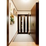 玄関ドアはすりガラスの扉をお選びいただき、光が差し込む明るい玄関に仕上げることが出来ました。 玄関収納は天井までの高さで収納力をアップし、ミラー貼りの扉にすることで空間の広がりを感じることができます。 また、壁面には奥様がお好きなグリーンを飾る棚をデザインしました。