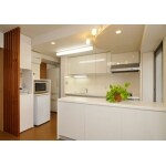 ダイニングとの壁をとりはらい、オープンキッチンにし、明るく広々とした空間プランをご提案。 家電用の収納棚を造作し、使いやすさにも配慮しました。側面には格子で仕切りをつけ、リビング側からは、スッキリとした印象に。 キッチン横の収納棚が、オープンキッチンにすることで目立ってしまうため扉を設置し、その扉を少し手前から斜めに取り付けることで、壁の凹凸を見せないように工夫。 この小さなひと工夫によってキッチンがより広く見えるようになりました。