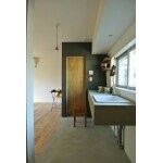 普通のシステムキッチンを取り付けるのではなく、モルタルで造作しました。 シンクと水栓しか付いていないシンプルなキッチンの出来上がりです。 1Rのアパートなので住む人が必ず料理をするわけではないだろう。 ガスコンロを置けば料理も出来るキッチンになる。という考えのもと作られたキッチンです。 オープンなキッチンなので家具の一つとしても利用できるほどシンプルです。