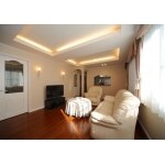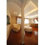 外すことができない梁や柱を、あらかじめ想定した上で完成イメージをご提案しました。上飾り付きのカーテンや、それにふさわしい大きさの窓、間接照明を設置した折り上げ天井なども含めて、エレガントな空間を演出しました。構造上外せない柱は、曲線の装飾を施すことによって、空間に調和させることができました。