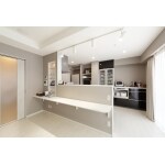 幅2.7mのシステムキッチンと、背面のカップボードはTOTOのミッテを使用しております。また、キッチン正面のカウンター付の腰壁は少し高めに新設して、キッチンの手元がリビング側から見えにくいような工夫をしております。ニッチにはガラス棚を使っており、ちょっとした小物を飾るとおしゃれです。