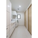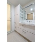 洗面化粧台はLIXILのピアラにお取替えしました。 化粧台本体の左側にもサイドキャビネットを設置し、ご家族3人分の荷物も十分に収納できる収納量を確保しました。