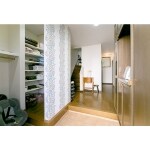 和室側に玄関を広げてウィークスルークローゼットを新設するご提案をさせて頂きました。壁紙の縦ラインも花柄のアクセントで天井を高く見せています。また、お客様の通路と、ウォークスルークローゼット側を分けることで、隠しながら収納が可能です。
