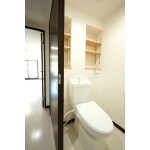無駄を省いてシンプルかつ機能的なトイレに。クッションフロアー・ビニルクロス共に汚れをサッと拭き取れ、いつでも清潔簡単キープ。