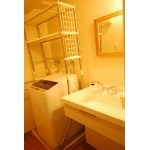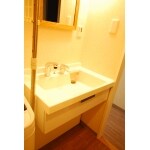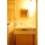 (旧京都建物株式会社(京都建物工務店リフォーム)での事例です。)床を広く見せる為に、椅子に座りながらでも使用出来るニースペースタイプの洗面化粧台をご選定頂き、お施主様こだわりの鏡と照明を取り付けオリジナルの洗面台が完成しました。
