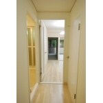 (旧京都建物株式会社(京都建物工務店リフォーム)での事例です。)廊下からダイニングへ入る扉を新しく入れ替え、濃い色の木部は白色に塗装。 玄関を開けた瞬間に広がる明るい空間。 リフォーム前の暗かった雰囲気はまったく感じさせない仕上がりとなりました。