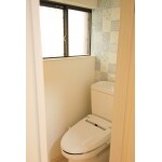 (旧京都建物株式会社(京都建物工務店リフォーム)での事例です。)トイレは最新のものに新調し、こだわりの壁紙で明るくおしゃれな印象に仕上げました。全体の壁紙の貼り替えと、床材は掃除のしやすいクッションフロアーに貼り替えさせていただきました。