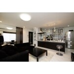 全体をモノトーンカラーでまとめ統一感を出しながらも、麻の床材や格子の引戸など、和の要素を取り入れることで空間にメリハリを加えました。