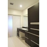 収納力のある大きな化粧台。洗濯機が邪魔にならないような配置。