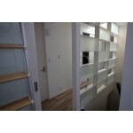 階段脇を壁にしてしまうと暗くなってしまい圧迫感がでます。開口部と擦りガラスを交互にした棚は開口部には小物等レイアウトでき、擦りガラスからはやさしい光が入ります。