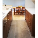 キッチンスペースは奥様こだわりの空間。 床はフロアタイル、背面収納にはアクセントでモザイクタイルを。キッチン前のニッチスペースは無垢材に塗装を施しました。