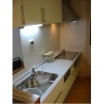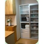 キッチンの場所を動線に配慮して移動することで、全体が洗練された雰囲気になるように考えました。 キッチンのカップボードも設置し、家電や食器類をまとめて収納し、かつ寸法に配慮してカップボード横の収上下の収納は大工さんに造作で作ってもらいました。