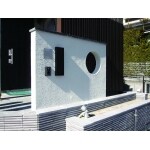 庭とガレージがバリアフリーで行け、2台分の車をゆったり停められるようご提案。床面には黒玉石を入れた曲線の砂利溝をはじめ、数種類の仕上げ材を使用してグレーの濃淡でまとめたデザインに。