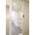 洗面室に扉が無かったので、洗濯機の搬入などを考慮して引違戸を新設しました。 寒い時期は引違戸を閉めて、バスルームの暖房機で入浴前に洗面室も暖めておくとヒートショックの予防にもなります。 洗面化粧台はLED照明やカチットシャワー水栓で節湯でき、引出収納は出し入れしやすいです。 洗濯機防水パンや洗濯機用水栓、照明器具やスイッチなども全て交換しました。