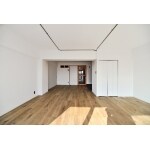 空間を広げるには、間仕切壁を取り払うだけでは足りず、天井も取り払い、高さ方向にも広がりをもたせました。 全体を白の塗装とし、色味としても清潔感と広がりを持てるように演出。床はフローリングの突き板を採用し、無垢の手触りと表情を楽しめるように致しました。