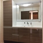 人工大理石の一体型ハイバックカウンターでお掃除が格段に楽になりました。 すっきりした収納で用途に応じて高率的な収納が可能となりました。 洗面台の大きさは変わりないが、形状や配置によりスペースが有効に使えるようになりました。