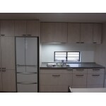 シンク部を壁側に、吊り戸、収納キャビ、冷蔵庫スペースをすべて壁側におさめ、反対側にコンロ部を設置のご提案。