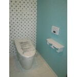 トイレ交換に合わせて内装も一新。施主様がこだわってお選びいただいた北欧製の壁紙を2色使いして、明るくポップな空間になりました。