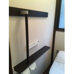 強固でありながら壁補強の必要もない棚板付きの手すりを設置しました。施工も簡単でリフォームに最適です。 棚板は立ちあがる際の支えになるだけでなく、携帯や新聞などちょっとしたものを置くこともでき便利です。