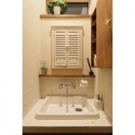 コンパクトだが気に入ったものをと、細部にこだわった仕様。モザイクタイルをランダムに貼ったり、鏡にも扉をつけて隠したり。