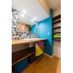 当初は給水・排水管交換も含め洗面室の全面改装という内容でしたので、既製品の洗面台もご検討されておりました。打合せの中で、「実は、既製品ではなくオリジナルな洗面空間を造りたい」とのご希望を伺いました。そこで正面の壁をタイル仕上げにし、大きめの鏡を取付、耐水カウンターを使用した奥行き感のある広々とシンプルなプランをご提案致しました。何度かお客様のご要望に合わせて、シンクや蛇口・照明スイッチ等の商品選定を繰り返し、掲載写真の仕様を決めさせて頂きました。当初のご予算もありましたが、「ご自分たちらしく暮らしたい」お客様のご要望にフィットするプランづくりをさせて頂いた結果ご採用頂きました。 また、デザイン性だけではなく、構造上洗面台の上部に梁が有り、洗面台に立った時の圧迫感の解消と、梁と鏡の間の天井にダウンライトを2灯設置する事で光が行き届く明るい空間をご提案致しました。 ご予算を抑える為に、設備品等の一部をご支給頂いたり、ニッチスペースの収納棚の棚板はご主人様に色を塗って作って頂くなど、施主様にも大変ご協力を頂きました。 お客様と一緒に完成させて頂きました。