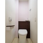 配管を隠し、収納キャビネットも一体になった、TOTOレストパルをお勧め。壁紙もアクセント貼りにし、すっきりさせる提案を採用していただきました。