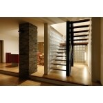 建物の中央に階段を移設。 屋上からの光を吹き抜けをつくり1Fリビングまで持ってきました。採光と空調とデザイン性 確保のため、ガラスブロックを使用。 階段は鉄骨造の片持たせ、踏板と踊り場にはビンテージ材のタモ無垢材を蜜蝋WAXにて使用。