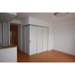 和室は仕切り壁を無くし、L字の引戸で区切りました。 その際既存ドアを移設し再利用しました。 壁を無くしたことでLDKと繋がった空間にし、「LDKの拡張」と「和室リニューアル」を実現しました。 和室の段差を解消し、新しく張った畳もフラットにしたことにより、リビングのフローリングとの一体感を出しました。