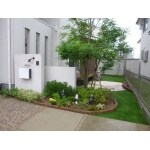 ローメンテナンスな庭空間へとお手伝いいたしました。デッキを降りたところにサークル状のテラスを設け、テーブルやイスを置いてくつろげるようにしました。植栽スペースはレンガで仕切りをつくり、手入れのしやすい花壇になって花好きの奥様がいろんな種類の草花を植えています。庭は人工芝を張り、裏は防草シート・砂利を敷いています。