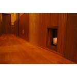無垢材が玄関まで伸びていきまとまりのある空間に。長い廊下でも無垢材の存在感は抜群です。 また、リビングとダイニングの壁にはペット専用扉を設置。いつでも自由にネコちゃんが出入りできます。