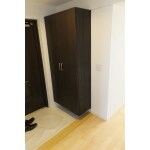 (平成29年4月1日 体制変更以前の(旧)永大プランニングの実績です)元々の汚れてしまった玄関下駄箱を撤去し収納量をアップしました。また、回りの建具(ドア)に色を合わせて統一しました。 濃い色の収納ですが、回りの色とのバランスで玄関回りは暗く見えません。
