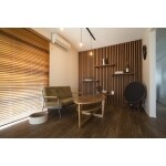 洋室に替えて、リビングとしました。 木製のブラインドと正面の壁面ルーバーがとっても素敵ですね。 床材は塩ビタイル仕上げです。 床材:リリカラ LYT-83287塩ビタイル 大きな窓には木製のブラインドを取り付けました。カーテンやロールスクリーンにない味わいを感じられます。