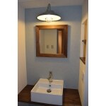 オリジナルの洗面台。使いやすいように壁に二段の収納スペース(ニッチ)を作り、コンセントやスイッチも一カ所にまとめ、ダークブラウンの木目ととても相性が良いアンティークブルーの壁紙と照明を使用しました。