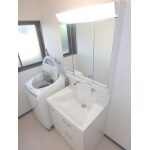 壁紙や床のクッションフロアを貼り替え、明るくすっきりした印象の洗面所になりました。