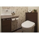 壁に花柄のアクセントクロスを貼り、シックな印象のトイレになりました。 便器と手洗い器と両方に収納キャビネットがあり、トイレ用品が中に納まりいつもすっきりとした空間を保てるように。