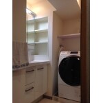 しっかりとした棚板を取り付けました。 洗濯カゴや洗剤を置いたり、多目的に使えます。